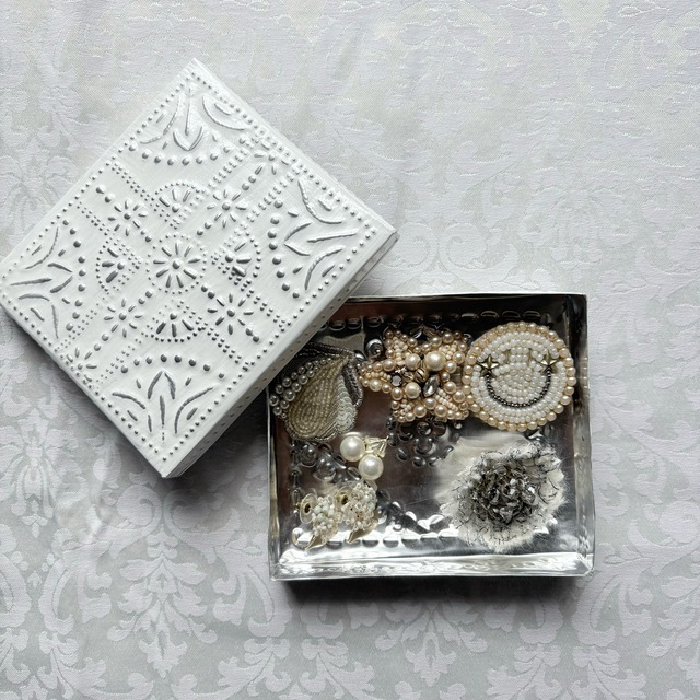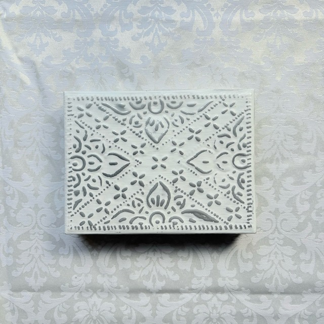 アルミジュエリーBOX長方形M ホワイト 【BOX本体のみ】 kashiオリジナルのアルミBOXです。 アルミBOXはバリ島の職人さんが手作業で作ってくれています。 アルミの一枚板を切って、金属の棒で叩いて模様を打ち出しします。 バリ島に昔から伝わる伝統技術と雇用を守るサステナブルなプロダクトです。 手作業で打ち出した模様は繊細でありながら温かみがあり、一点一点少しずつ違いが出るのも特徴です。 シンプルで飽きが来なくエスニックな雰囲気を楽しめるシルバーと、シックさと可憐さを兼ね備えたホワイトの2色展開です。 ベロアジュエリーケースの入ったジュエリーボックスタイプもご用意があります。 ーーーーーーーーーーーーーーーーーーー 素材 アルミニウム サイズ 縦約10.5㎝×横約12㎝ 高さ(蓋込み)2.5㎝ 深さ(ボックス本体)2㎝ ーーーーーーーーーーーーーーーーーーー 注意点 ★アルミニウム変色しない素材ですが、長く使用すると表面に小さな傷が積み重なり全体的に白銀色に変化することがあります。 ★柔らかく変形しやすい素材です。強い力を加えないで下さい。 ★海外での手作り品です。一点ずつ形の違いや柄の出方の違いがあります。予めご了承下さい。 ★大ぶりの宝石やチャームの付いたリングは蓋が閉まらなくなることがあります。ご注意下さい。 ★アクセサリーは全て参考商品です。 ーーーーーーーーーーーーーーーーーーー 発送方法 ヤマト運輸 宅急便コンパクト