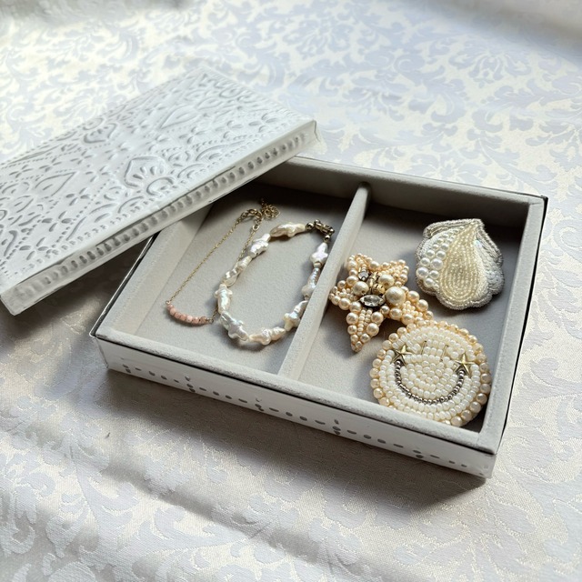 アルミジュエリーBOX長方形L ホワイト 【ベロアジュエリーケース付き】 kashiオリジナルのアルミBOXにベロアのジュエリーケースを入れた、 とっておきのジュエリーBOXです。 アルミBOXはバリ島の職人さんが手作業で作ってくれています。 アルミの一枚板を切って、金属の棒で叩いて模様を打ち出しします。 バリ島に昔から伝わる伝統技術と雇用を守るサステナブルなプロダクトです。 手作業で打ち出した模様は繊細でありながら温かみがあり、一点一点少しずつ違いが出るのも特徴です。 シンプルで飽きが来なくエスニックな雰囲気を楽しめるシルバーと、シックさと可憐さを兼ね備えたホワイトの2色展開です。 ベロアリング台の入ってないボックスのみのタイプもご用意があります。 ーーーーーーーーーーーーーーーーーーー 素材 アルミニウム サイズ 縦約12㎝×横約16㎝ 高さ(蓋込み)2.5㎝ 深さ(ボックス本体)2㎝ ーーーーーーーーーーーーーーーーーーー 注意点 ★アルミニウム変色しない素材ですが、長く使用すると表面に小さな傷が積み重なり全体的に白銀色に変化することがあります。 ★柔らかく変形しやすい素材です。強い力を加えないで下さい。 ★海外での手作り品です。一点ずつ形の違いや柄の出方の違いがあります。予めご了承下さい。 ★大ぶりの宝石やチャームの付いたリングは蓋が閉まらなくなることがあります。ご注意下さい。 ★アクセサリーは全て参考商品です。 ーーーーーーーーーーーーーーーーーーー 発送方法 ヤマト運輸 宅急便コンパクト