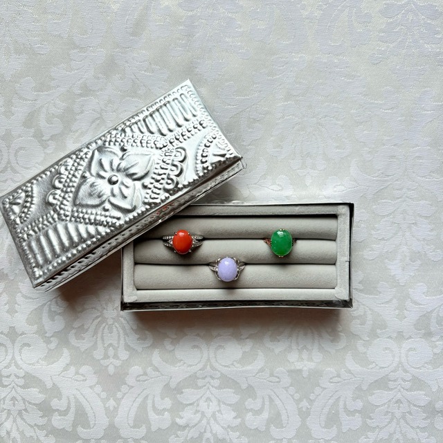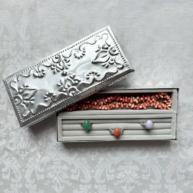 アルミジュエリーBOX長方形XS シルバー 【ベロアリングケース付き】 KashiオリジナルのアルミBOXにベロアのリング台を入れた、とっておきのジュエリーBOXです。 アルミBOXはバリ島の職人さんが手作業で作ってくれています。 アルミの一枚板を切って、金属の棒で叩いて模様を打ち出しします。 バリ島に昔から伝わる伝統技術と雇用を守るサステナブルなプロダクトです。 手作業で打ち出した模様は繊細でありながら温かみがあり、一点一点少しずつ違いが出るのも特徴です。 シンプルで飽きが来なくエスニックな雰囲気を楽しめるシルバーと、シックさと可憐さを兼ね備えたホワイトの2色展開です。 ベロアリング台の入ってないボックスのみのタイプもご用意があります。 ーーーーーーーーーーーーーーーーーーー 素材 アルミニウム サイズ 縦約5.5㎝×横約12㎝ 高さ(蓋込み)2.5㎝ 深さ(ボックス本体)2㎝ 原産国 インドネシア ーーーーーーーーーーーーーーーーーーー 注意点 ★アルミニウム変色しない素材ですが、長く使用すると表面に小さな傷が積み重なり全体的に白銀色に変化することがあります。 ★柔らかく変形しやすい素材です。強い力を加えないで下さい。 ★海外での手作り品です。一点ずつ形の違いや柄の出方の違いがあります。予めご了承下さい。 ★大ぶりの宝石やチャームの付いたリングは蓋が閉まらなくなることがあります。ご注意下さい。 ★アクセサリーは全て参考商品です。 ーーーーーーーーーーーーーーーーーーー 発送方法 ヤマト運輸 宅急便コンパクト