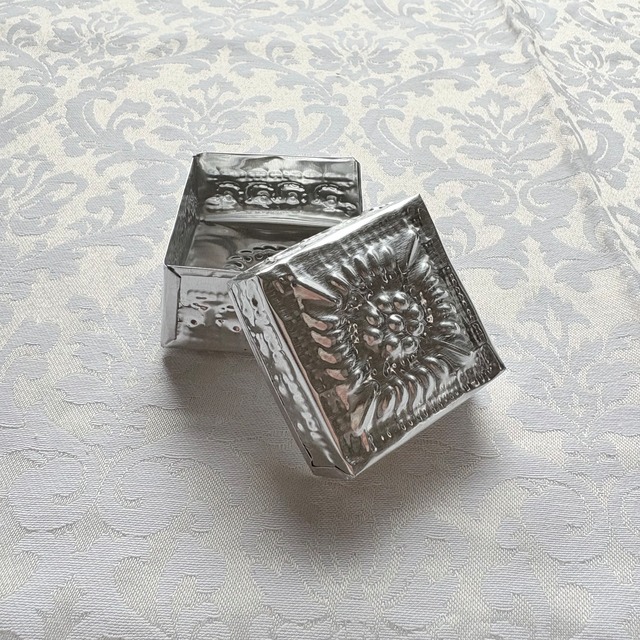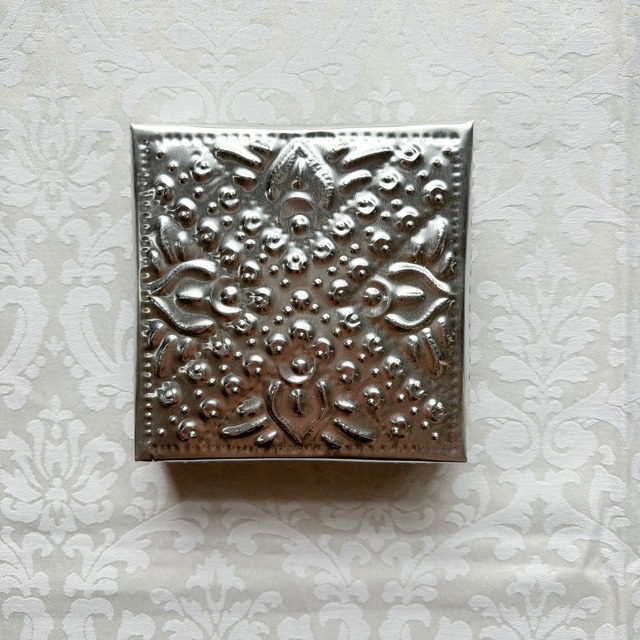 アルミBOX正方形 シルバー【10×10】 kashiオリジナルの正方形アルミBOXです。 アルミBOXはバリ島の職人さんが手作業で作ってくれています。 アルミの一枚板を切って、金属の棒で叩いて模様を打ち出しします。 バリ島に昔から伝わる伝統技術と雇用を守るサステナブルなプロダクトです。 手作業で打ち出した模様は繊細でありながら温かみがあり、一点一点少しずつ違いが出るのも特徴です。 シンプルで飽きが来なくエスニックな雰囲気を楽しめるシルバー、シックで可憐なホワイト、リゾート感とかわいらしさの感じられるミントの三色展開です。 スペシャルな気持ちで使えるミニサイズのBOX、 ちょっとした小物入れやアクセサリーケースとして便利です。 ーーーーーーーーーーーーーーーーーーー 素材 アルミニウム サイズ 縦10㎝×横10㎝ 高さ(蓋含む)2.5㎝ 深さ(BOX本体)2㎝ ーーーーーーーーーーーーーーーーーーー 注意点 ★アルミニウム変色しない素材ですが、長く使用すると表面に小さな傷が積み重なり全体的に白銀色に変化することがあります。 ★柔らかく変形しやすい素材です。強い力を加えないで下さい。 ★海外での手作り品です。一点ずつ形の違いや柄の出方の違いがあります。予めご了承下さい。 ★大ぶりの宝石やチャームの付いたリングは蓋が閉まらなくなることがあります。ご注意下さい。 ーーーーーーーーーーーーーーーーーーー 発送方法 ヤマト運輸 宅急便コンパクト