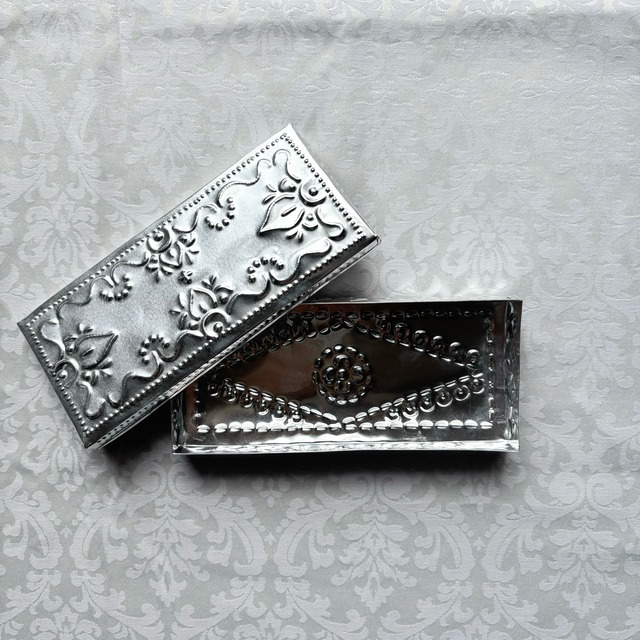 アルミジュエリーBOX長方形M シルバー 【BOX本体のみ】 kashiオリジナルのアルミBOXです。 アルミBOXはバリ島の職人さんが手作業で作ってくれています。 アルミの一枚板を切って、金属の棒で叩いて模様を打ち出しします。 バリ島に昔から伝わる伝統技術と雇用を守るサステナブルなプロダクトです。 手作業で打ち出した模様は繊細でありながら温かみがあり、一点一点少しずつ違いが出るのも特徴です。 シンプルで飽きが来なくエスニックな雰囲気を楽しめるシルバーと、シックさと可憐さを兼ね備えたホワイトの2色展開です。 ベロアジュエリーケースの入ったジュエリーボックスタイプもご用意があります。 ーーーーーーーーーーーーーーーーーーー 素材 アルミニウム サイズ 縦約10.5㎝×横約12㎝ 高さ(蓋込み)2.5㎝ 深さ(ボックス本体)2㎝ ーーーーーーーーーーーーーーーーーーー 注意点 ★アルミニウム変色しない素材ですが、長く使用すると表面に小さな傷が積み重なり全体的に白銀色に変化することがあります。 ★柔らかく変形しやすい素材です。強い力を加えないで下さい。 ★海外での手作り品です。一点ずつ形の違いや柄の出方の違いがあります。予めご了承下さい。 ★大ぶりの宝石やチャームの付いたリングは蓋が閉まらなくなることがあります。ご注意下さい。 ★アクセサリーは全て参考商品です。 ーーーーーーーーーーーーーーーーーーー 発送方法 ヤマト運輸 宅急便コンパクト
