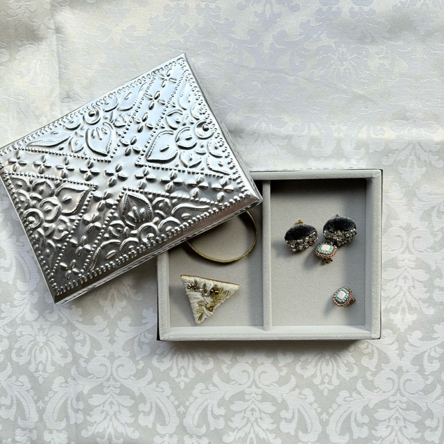 アルミジュエリーBOX長方形S シルバー 【ベロアジュエリーケース付き】 kashiオリジナルのアルミBOXにベロアのジュエリーケースを入れた、 とっておきのジュエリーBOXです。 アルミBOXはバリ島の職人さんが手作業で作ってくれています。 アルミの一枚板を切って、金属の棒で叩いて模様を打ち出しします。 バリ島に昔から伝わる伝統技術と雇用を守るサステナブルなプロダクトです。 手作業で打ち出した模様は繊細でありながら温かみがあり、一点一点少しずつ違いが出るのも特徴です。 シンプルで飽きが来なくエスニックな雰囲気を楽しめるシルバーと、シックさと可憐さを兼ね備えたホワイトの2色展開です。 ベロアリング台の入ってないボックスのみのタイプもご用意があります。 ーーーーーーーーーーーーーーーーーーー 素材 アルミニウム サイズ 縦約7.5㎝×横約17㎝ 高さ(蓋込み)2.5㎝ 深さ(ボックス本体)2㎝ ーーーーーーーーーーーーーーーーーーー 注意点 ★アルミニウム変色しない素材ですが、長く使用すると表面に小さな傷が積み重なり全体的に白銀色に変化することがあります。 ★柔らかく変形しやすい素材です。強い力を加えないで下さい。 ★海外での手作り品です。一点ずつ形の違いや柄の出方の違いがあります。予めご了承下さい。 ★大ぶりの宝石やチャームの付いたリングは蓋が閉まらなくなることがあります。ご注意下さい。 ★アクセサリーは全て参考商品です。 ーーーーーーーーーーーーーーーーーーー 発送方法 ヤマト運輸 宅急便コンパクト