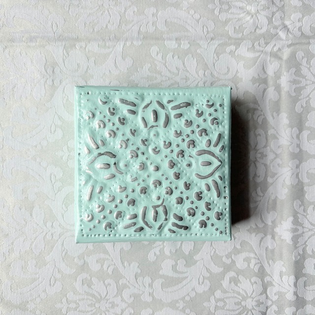 アルミBOX正方形 ミント【10×10】 kashiオリジナルの正方形アルミBOXです。 アルミBOXはバリ島の職人さんが手作業で作ってくれています。 アルミの一枚板を切って、金属の棒で叩いて模様を打ち出しします。 バリ島に昔から伝わる伝統技術と雇用を守るサステナブルなプロダクトです。 手作業で打ち出した模様は繊細でありながら温かみがあり、一点一点少しずつ違いが出るのも特徴です。 シンプルで飽きが来なくエスニックな雰囲気を楽しめるシルバー、シックで可憐なホワイト、リゾート感とかわいらしさの感じられるミントの三色展開です。 スペシャルな気持ちで使えるミニサイズのBOX、 ちょっとした小物入れやアクセサリーケースとして便利です。 ーーーーーーーーーーーーーーーーーーー 素材 アルミニウム サイズ 縦10㎝×横10㎝ 高さ(蓋含む)2.5㎝ 深さ(BOX本体)2㎝ ーーーーーーーーーーーーーーーーーーー 注意点 ★アルミニウム変色しない素材ですが、長く使用すると表面に小さな傷が積み重なり全体的に白銀色に変化することがあります。 ★柔らかく変形しやすい素材です。強い力を加えないで下さい。 ★海外での手作り品です。一点ずつ形の違いや柄の出方の違いがあります。予めご了承下さい。 ★大ぶりの宝石やチャームの付いたリングは蓋が閉まらなくなることがあります。ご注意下さい。 ーーーーーーーーーーーーーーーーーーー 発送方法 ヤマト運輸 宅急便コンパクト
