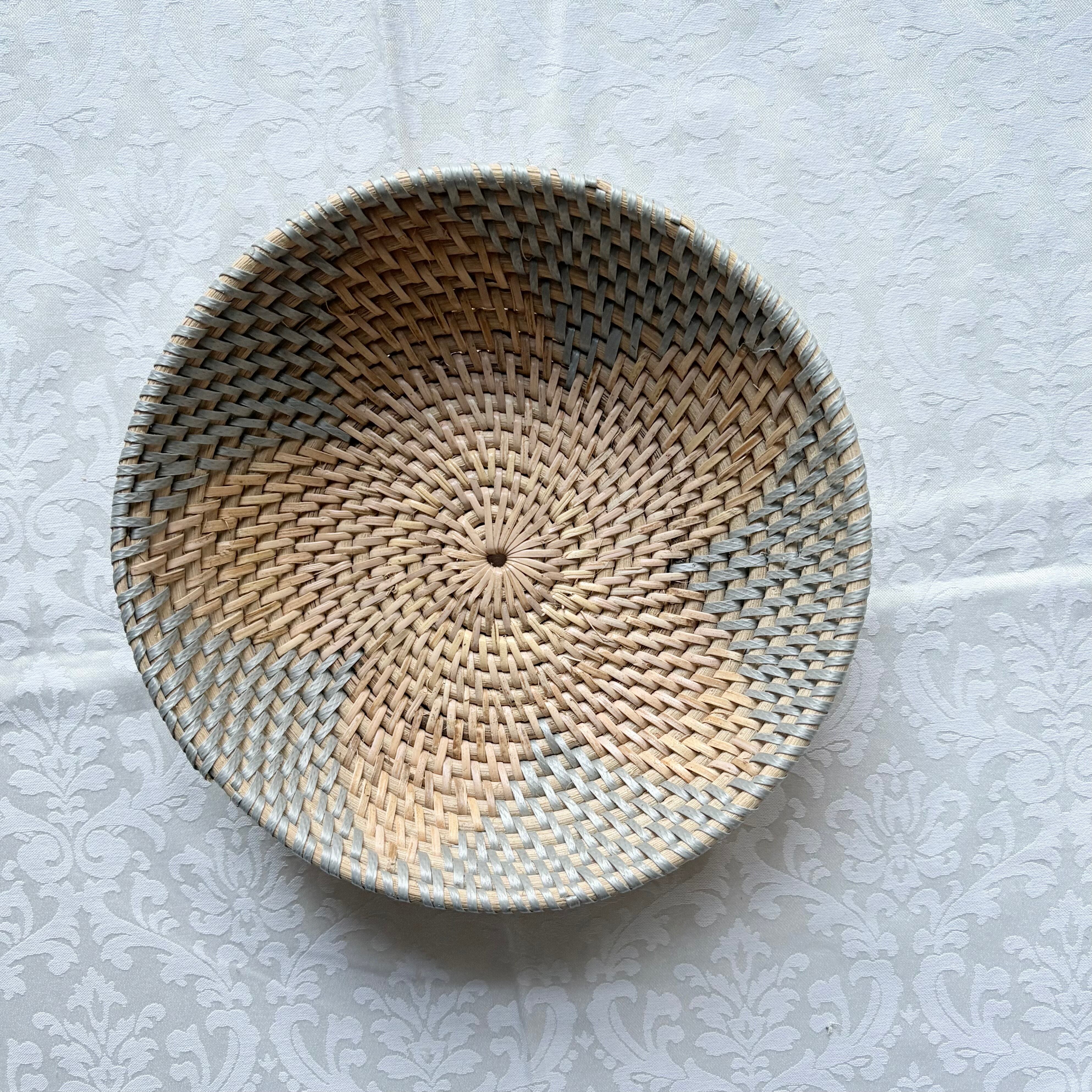 ラタンにカラーのプラスチックバンドを組み合わせて編み込んだ、お椀型のトレイです。