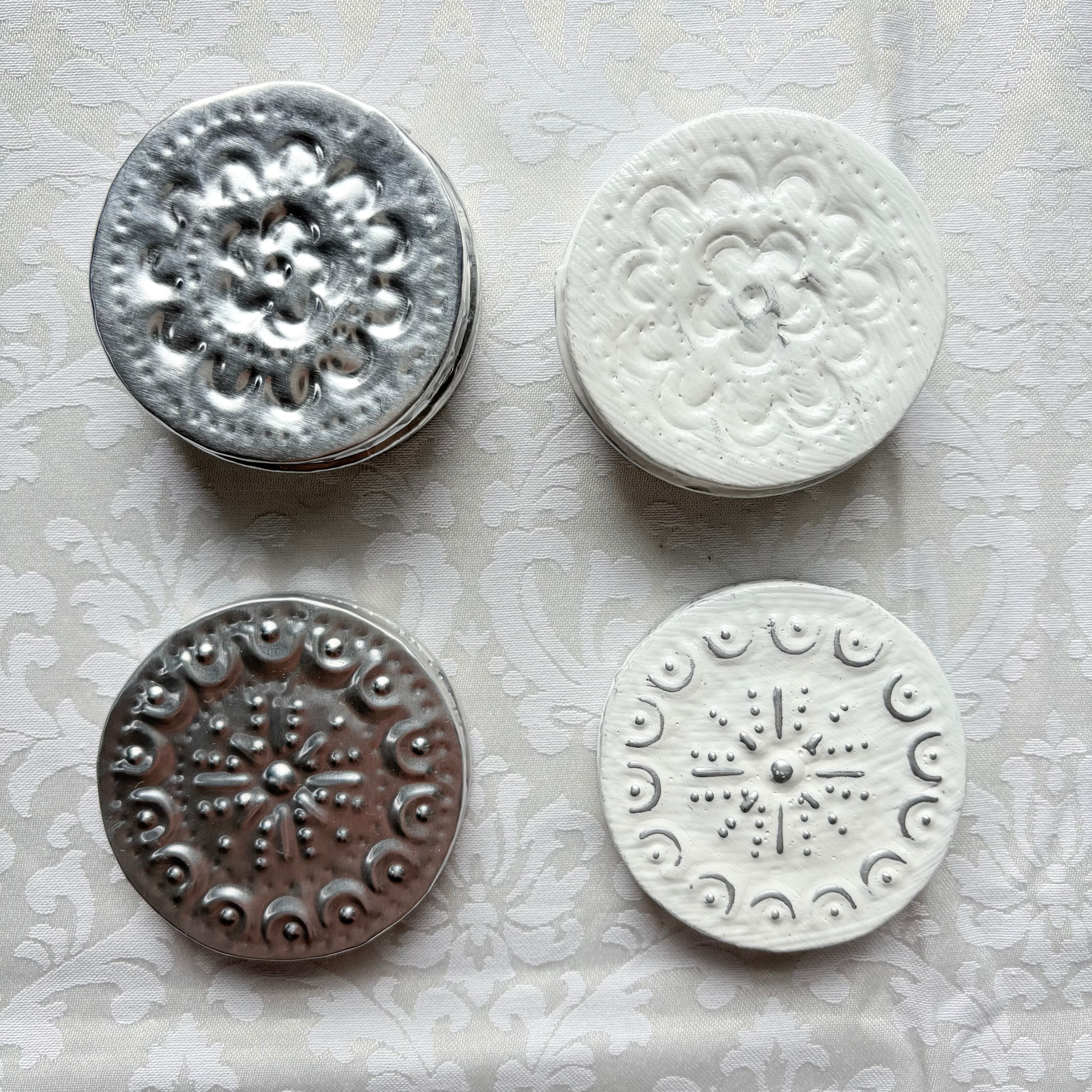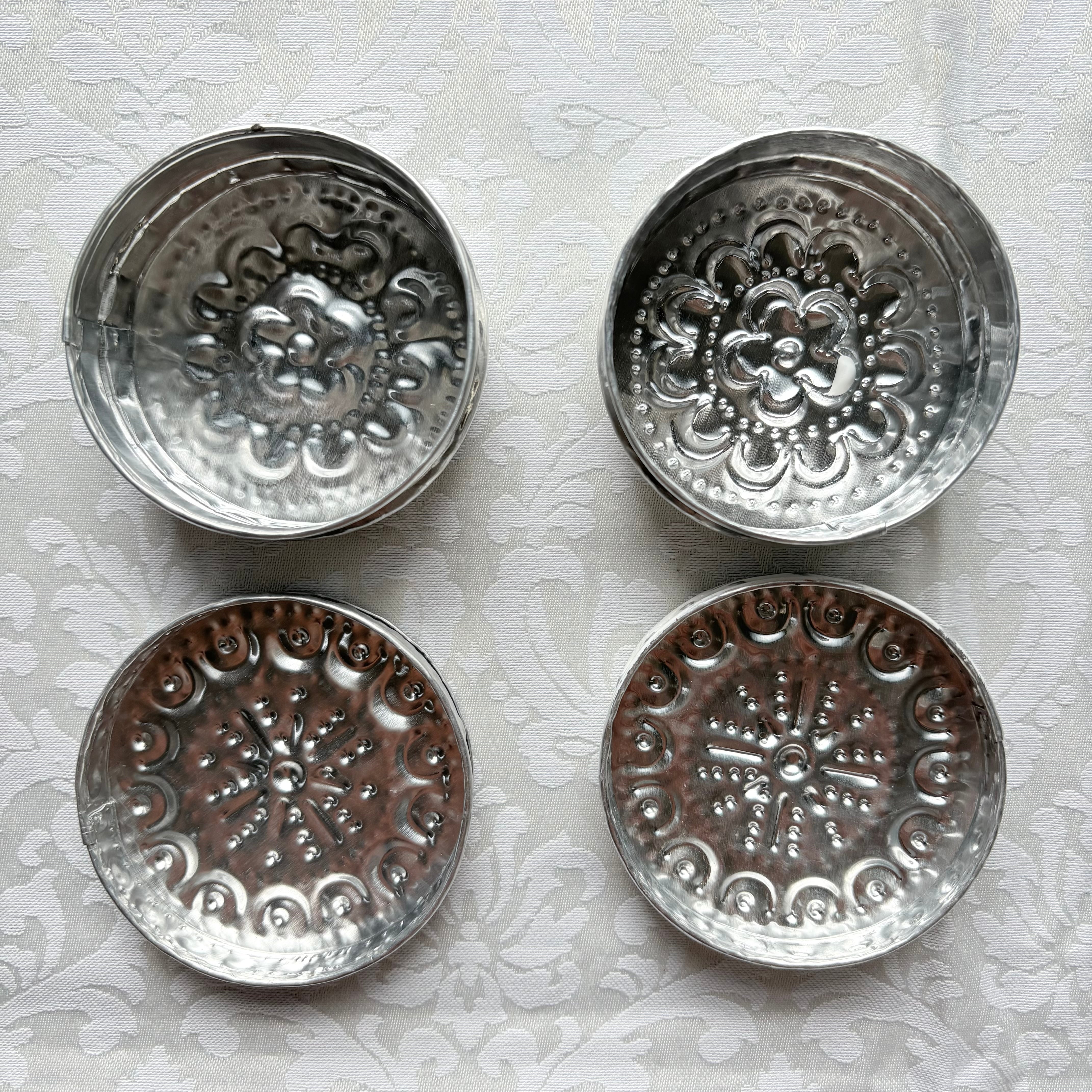 アルミの一枚板を切って、金属の棒で叩いて模様を打ち出しします。