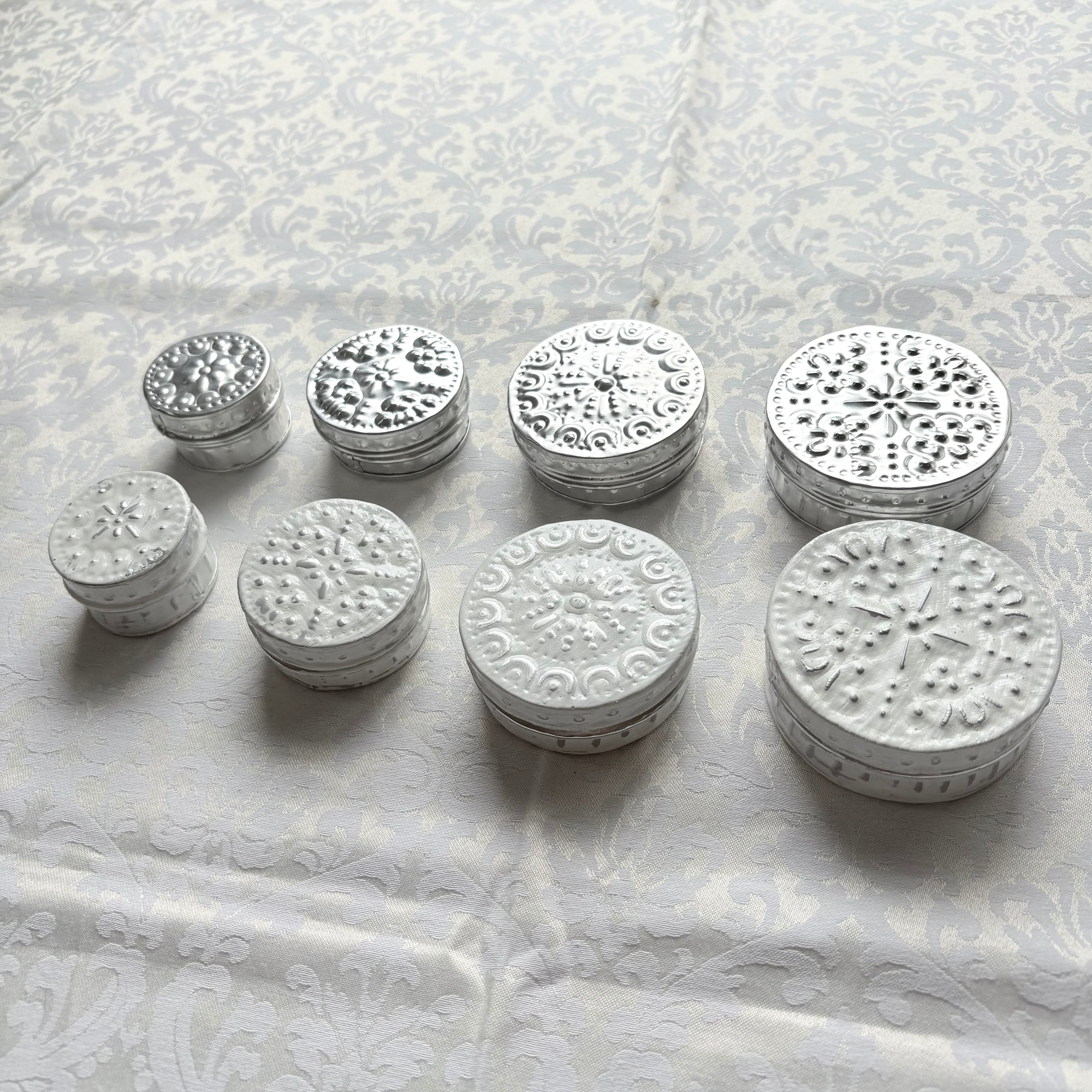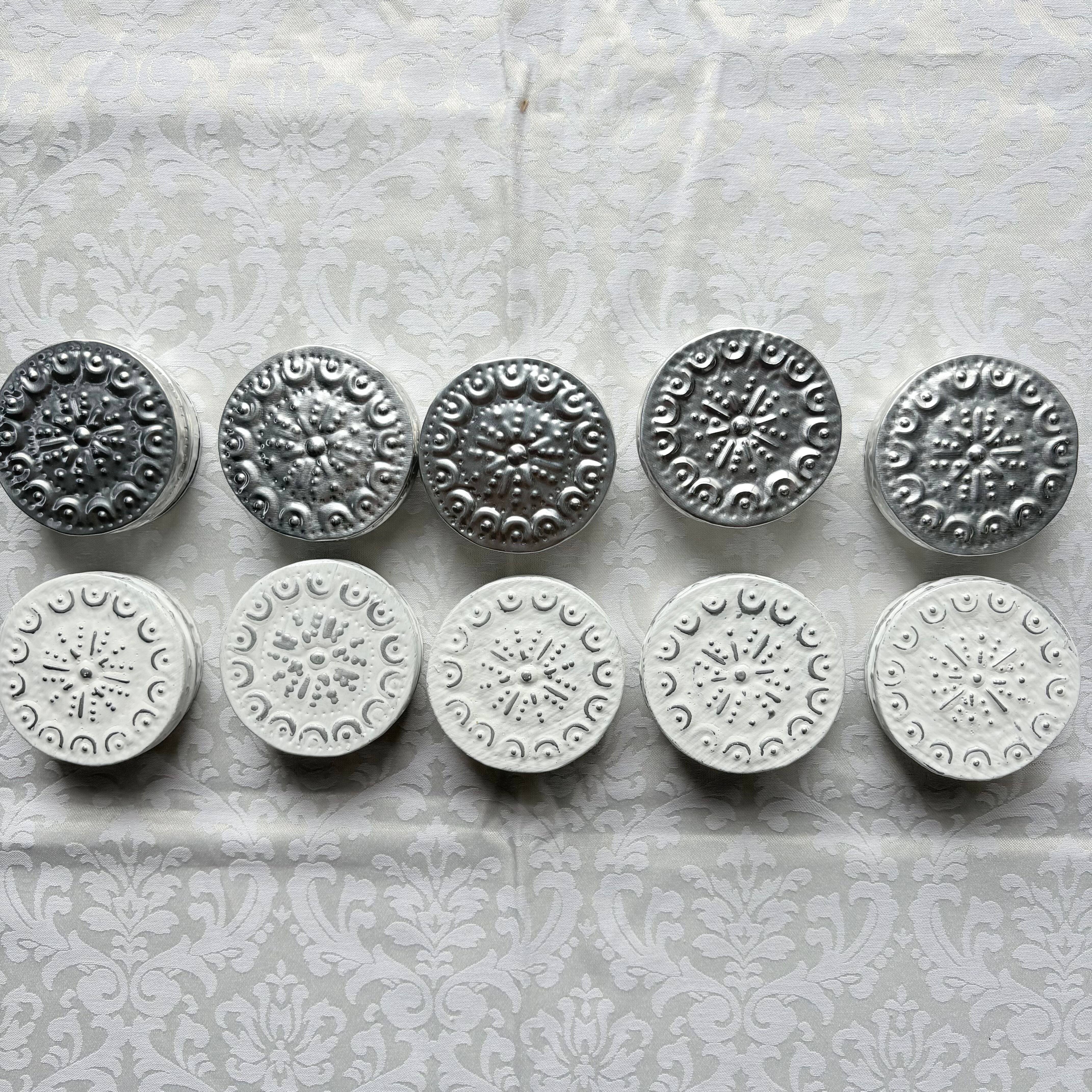 シンプルで飽きが来なくエスニックな雰囲気を楽しめるシルバーと、シックさと可憐さを兼ね備えたホワイトの2色を5点づつ入れてお届けします。