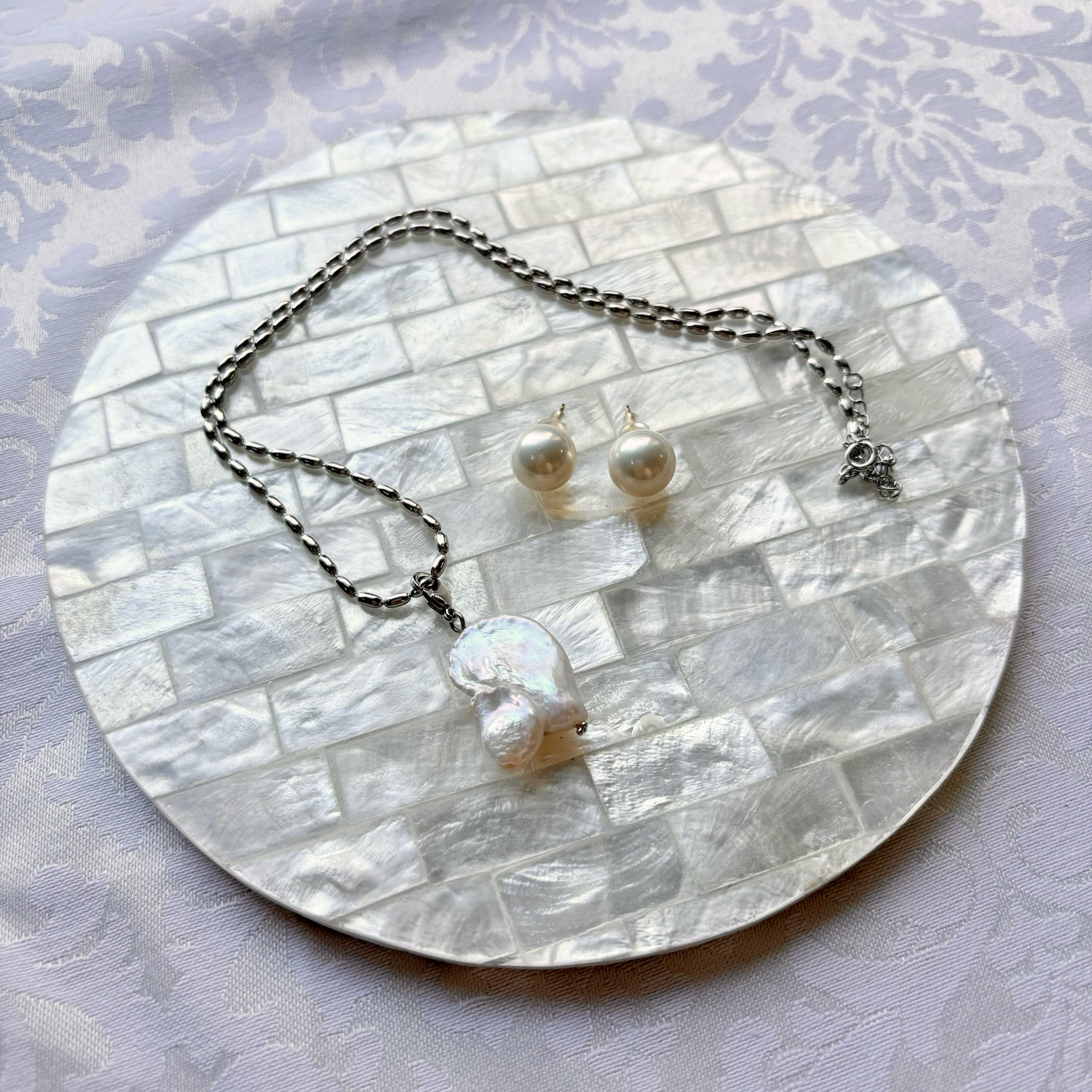 淡い白乳色にほんのりと光沢がかった、天然の貝殻が持つ色味が美しいです。